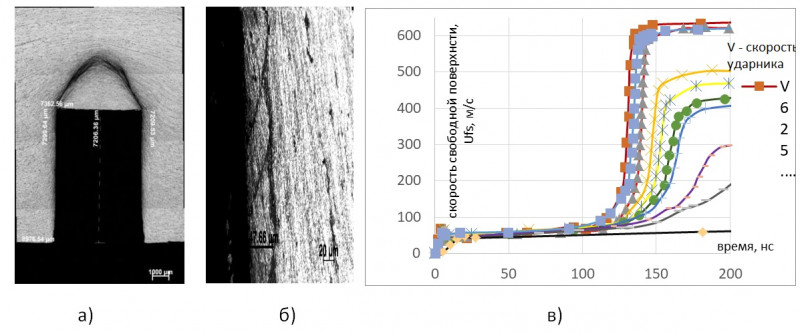 Рис. 3. а) - каверна в алюминиевом сплаве 1565; б) - структура боковой стенки каверны при взаимодействии с ударной волной; в) - семейство волновых профилей при ударном нагружении в диапазоне скоростей 200-650 м/с.